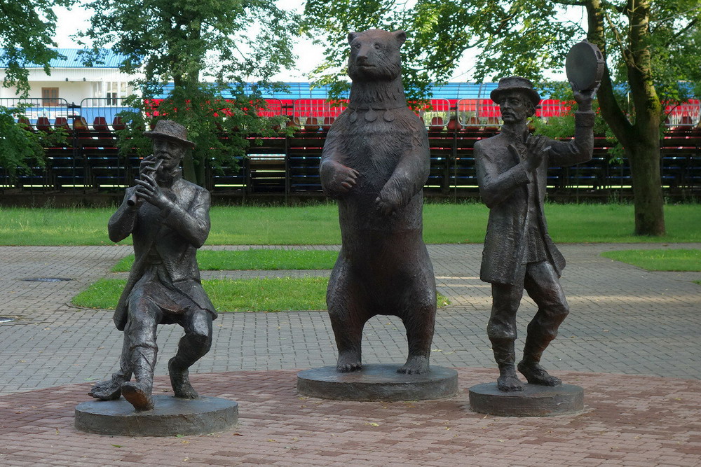 Скульптурная группа была создана заслуженным деятелем искусств и почетным гражданином города Сморгони Владимиром Теребуном. Она представляет собой чугунные фигуры двух скоморохов с музыкальными инструментами в руках, возле которых пляшет медведь, вставший на задние лапы.